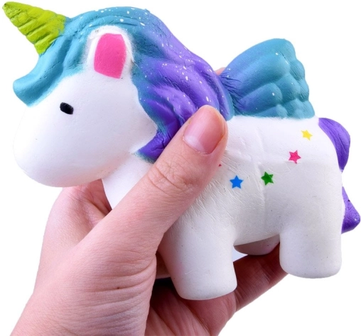 Strângerea unicornului squishy ajută la diminuarea tensiunii în timpul studiului, în sala de așteptare la medic sau pe parcursul unei zile solicitante.