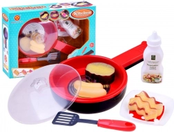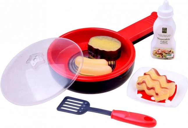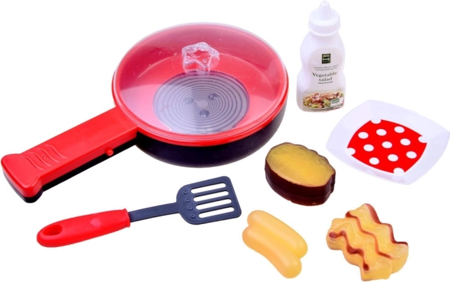 Setul include o tigaie, capac, mai multe tipuri de alimente și accesorii pe care copiii le pot folosi în jocurile de gătit.