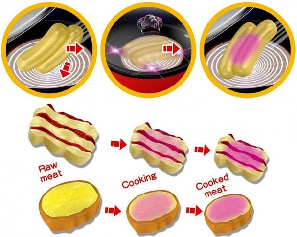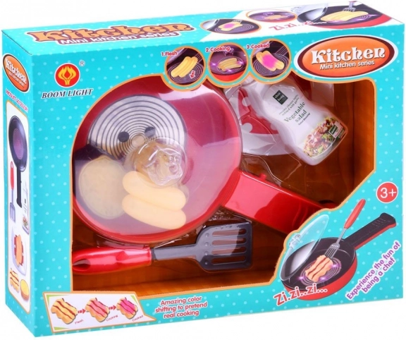 Acest set de bucătărie oferă distracție minunată pentru orice copil care iubește experiențele culinare. Tigaia, la apăsarea unui buton de pe mâner, luminează și emite sunete de mâncăruri prăjite, făcând jocul mai realist. În plus, produsele prăjite își schimbă culoarea sub influența luminii din tigaie.
