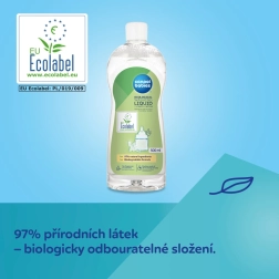 Delicat, dar foarte eficient pentru spălarea zilnică a biberoanelor și tetinelor. Formula cu 97% ingrediente de origine naturală îndepărtează resturile de lapte, cereale și sucuri, fără parfumuri și coloranți, cu pH neutru și o rețetă testată dermatologic. Biodegradabil și certificat EU Ecolabel, blând cu pielea și mediul.