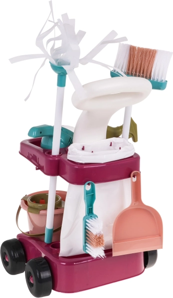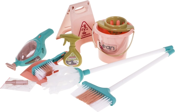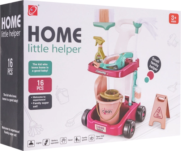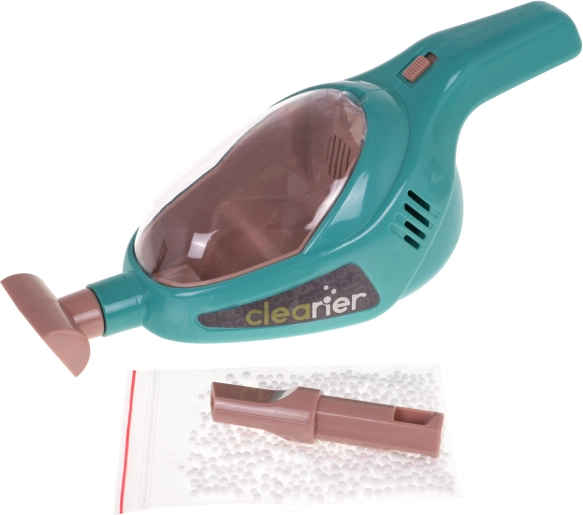 Setul mare de curățenie cu aspirator de mână și căruț pentru accesorii este potrivit pentru copii de la 3 ani. Setul a fost realizat cu atenție la detalii din materiale de cea mai înaltă calitate și este complet sigur pentru copil. Căruțul are roți mari, mâner confortabil pentru împins și două rafturi pentru depozitarea tuturor accesoriilor de curățenie. Setul include multe accesorii, de exemplu: găleată pentru mop, perie, făraș și periuță, imitație de mașină de spălat, aspirator de mână pe baterii, biluțe de polistiren, sac de gunoi din plastic și indicator de avertizare. Aspiratorul de mână este alimentat de 3 x AA 1,5V, bateriile nu sunt incluse. Are funcții sonore și luminoase, duze interschimbabile și aspiră cu adevărat biluțele de polistiren incluse în set. În timpul aspirării se aud sunete specifice activității, iar interiorul aspiratorului este iluminat.