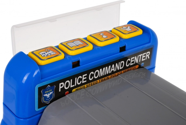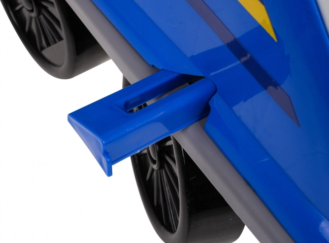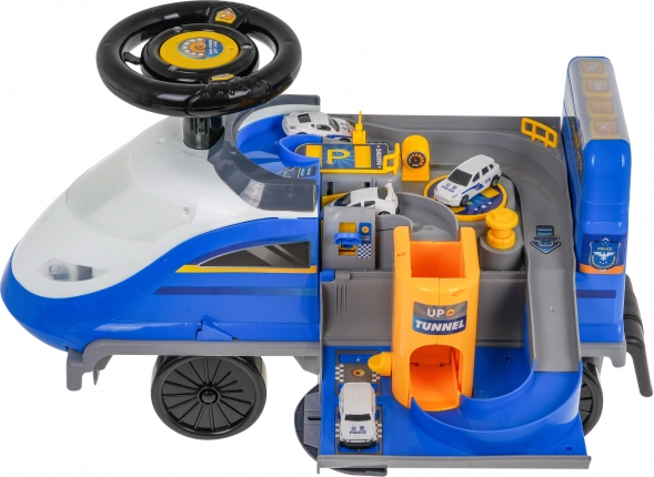 Sub scaun se află o parcare de poliție pliabilă cu tobogane, lift și căsuță pentru comori, ce pot fi acționate manual.