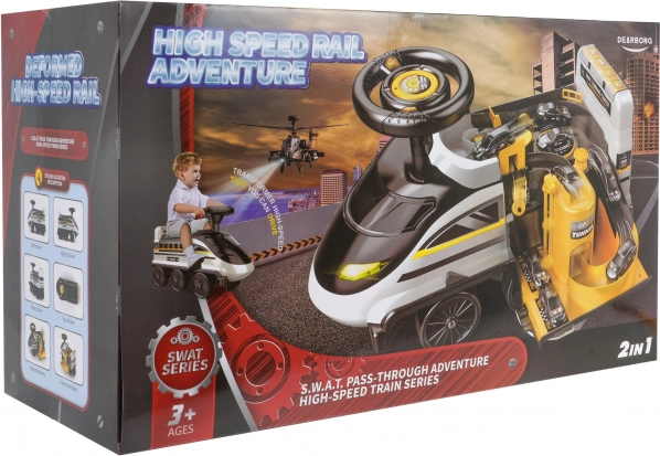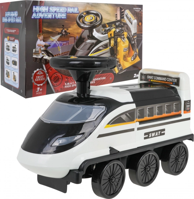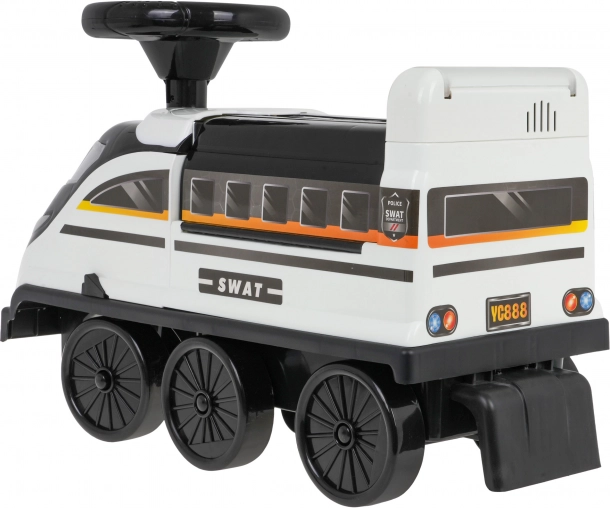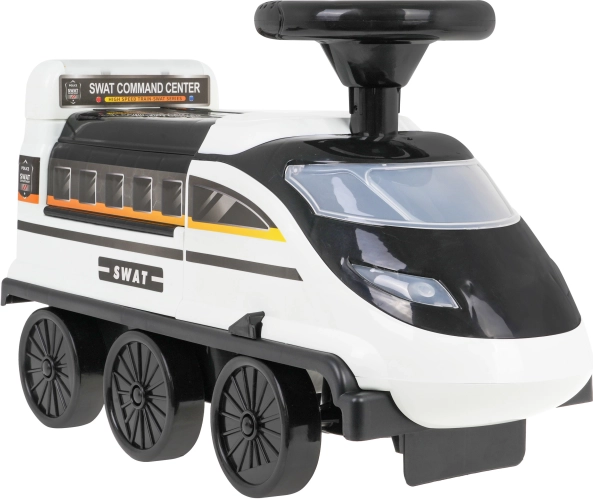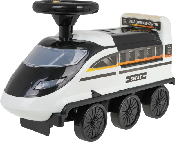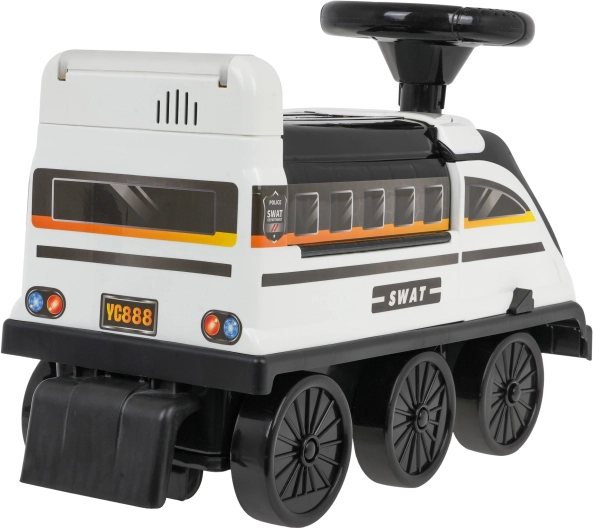 Vehiculul interactiv de împins în formă de locomotivă oferă experiențe de joacă de neconfundat. Realizat din plastic de înaltă calitate, durabil și netoxic. Acest vehicul rulează pe șase roți, dintre care două roți frontale sunt pivotante. Sub scaun se află un parc de poliție pliabil cu rampe, lift mobil, barieră care se deschide, cric și rotiță rotativă.