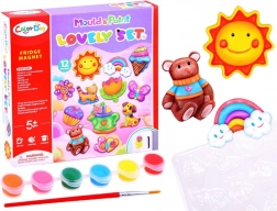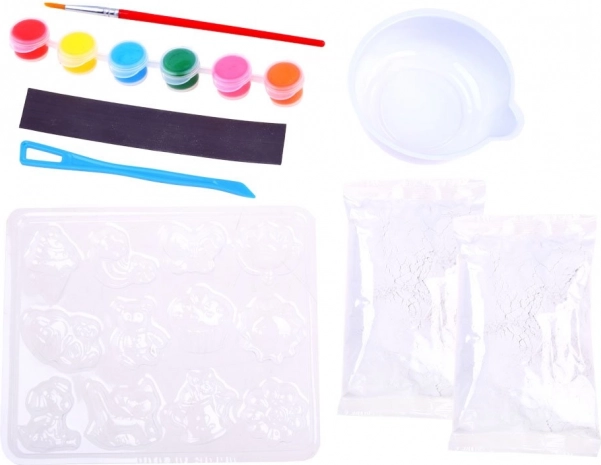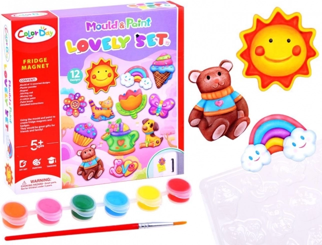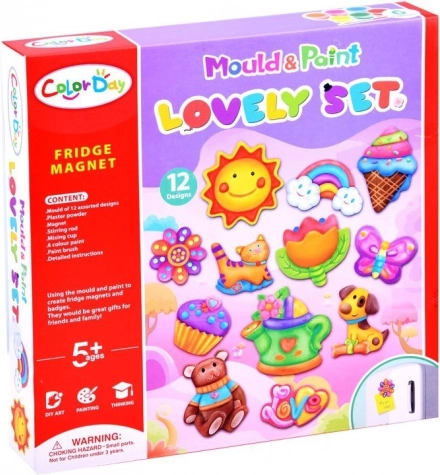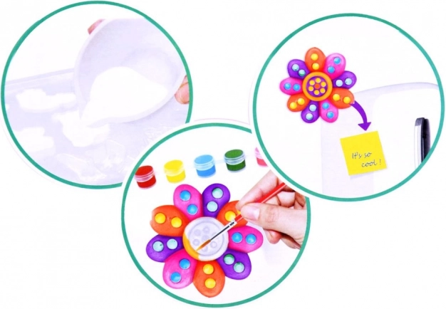 Acest set DIY le aduce copiilor bucuria creației de la primul amestec al ipsosului până la pictarea finală. Formele includ motive îndrăgite precum soare, flori, fluturi, curcubee, înghețate, brioșe, ursuleți, cănuțe de udare, pisici și inscripția LOVE. Creațiile finisate se echipează cu bandă magnetică și pot decora frigiderul, tabla sau orice suprafață metalică.