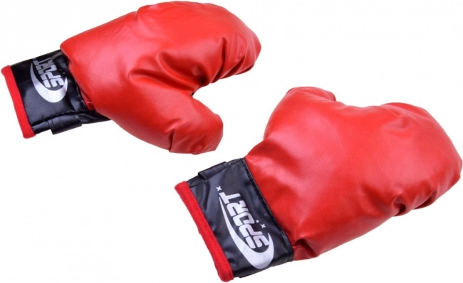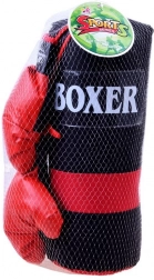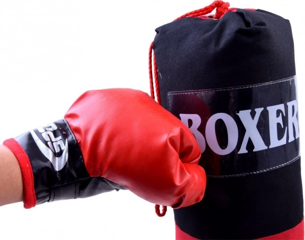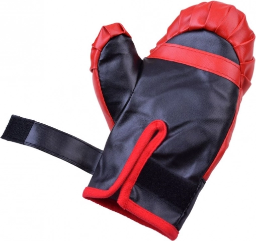 Mănușile din piele sintetică cu închidere cu arici se fixează bine pe mână, în timp ce sacul rezistent, cu inele metalice și șnururi, suportă impacturi repetate. Setul sprijină dezvoltarea coordonării mișcărilor, vitezei de reacție și abilității de a evita loviturile.