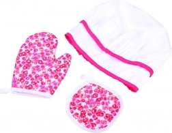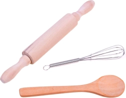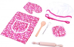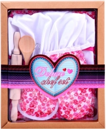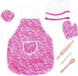 Include toate necesitățile pentru un mic bucătar: șorț, bonetă, mănușă, suport și unelte de bucătărie.