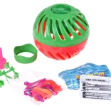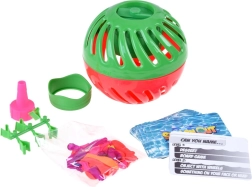 - Minge din două piese cu temporizator, margine (adaptor), piesă de umplere pentru baloanele cu apă, cărți cu întrebări (EN), cca 30 de baloane, 6 cleme reutilizabile