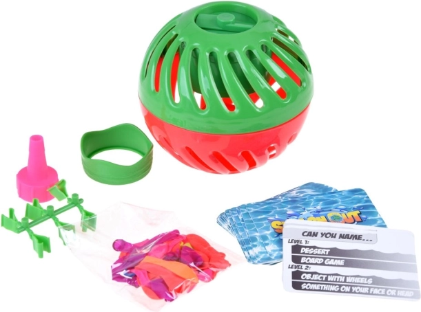 Jocul Splash Out aduce o mecanică simplă și distracție la maximum: umple baloanele cu apă, introdu-le în mingea din două piese cu temporizator, înfășoară timpul și începe să răspunzi. Pasează mingea până când timpul se termină – apoi balonul plesnește și cineva se va uda! Cărțile cu întrebări (în engleză) stimulează creativitatea și gândirea rapidă.