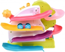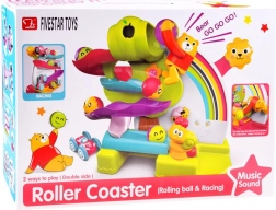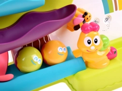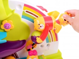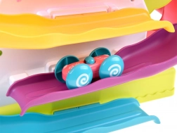 Pista interactivă 2‑în‑1 atrage prin culori vii, personaje drăgălașe și efecte captivante. În modul pentru bile, prin tragerea de maneta cu cap de leu, bila este ridicată la nivelul superior și pornește pe cele patru etaje în jos, însoțită de muzică veselă cu posibilitatea de reglare a volumului sau de oprire completă. În modul pentru mașinuță, este suficient să lași vehiculul de sus și să urmărești cum gonește până la final.