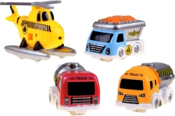 Sunt incluse trei vehicule de construcții – autobasculantă, betonieră, cisternă – și un elicopter. De asemenea, include o figurină de constructor pentru un joc și mai realist.