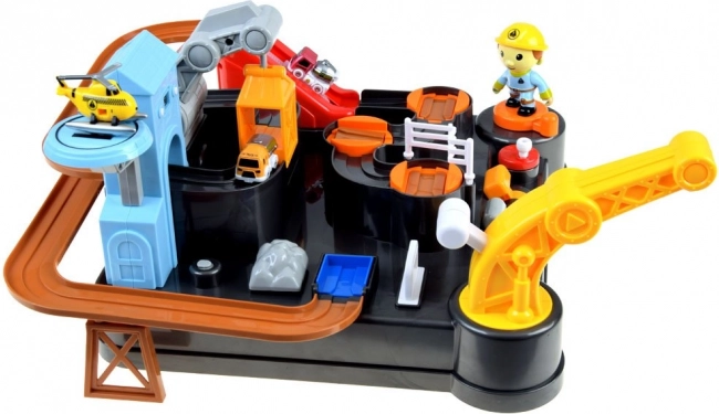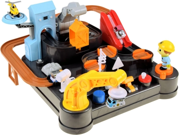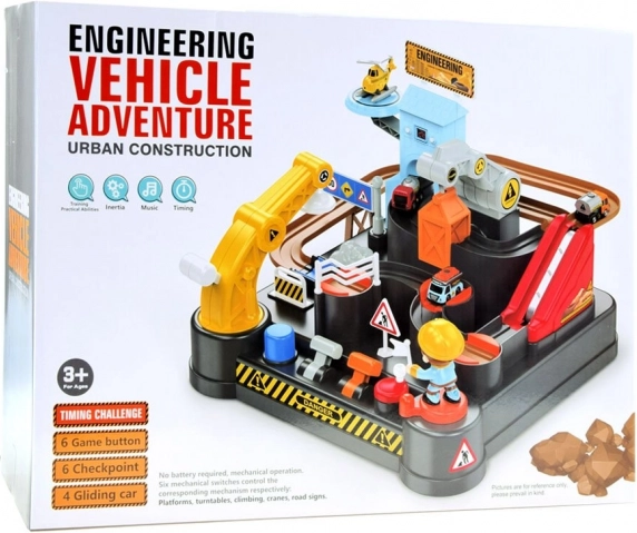 Această pistă mecanică colorată cu tematică de șantier oferă o scenă completă de construcții cu obstacole, lift și macara cu magnet. Copiii pot conduce vehiculele de la încărcare până la descărcare, pot controla turnantele și manetele și pot urmări cum mașinuțele se deplasează pe traseu. Ceasul digital integrat în turn permite măsurarea timpului de rulare și, la pornire, redă o melodie veselă.