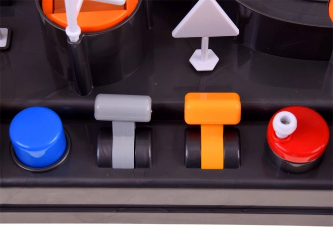 - Elemente interactive: turnantă portocalie și roșie, manetă galbenă pentru lift, manetă gri cu semn, buton albastru pentru lansarea mașinuței spre macara.