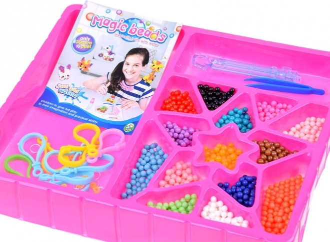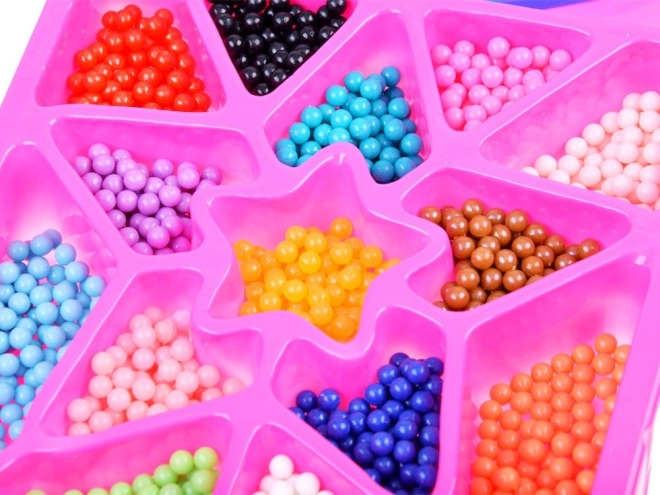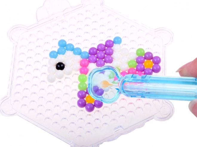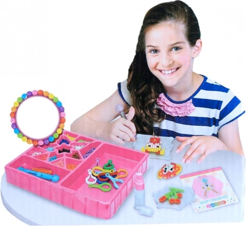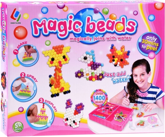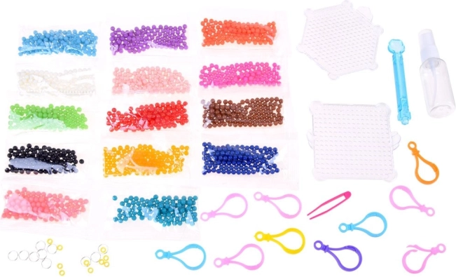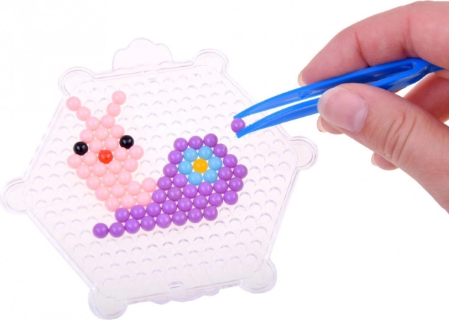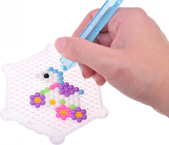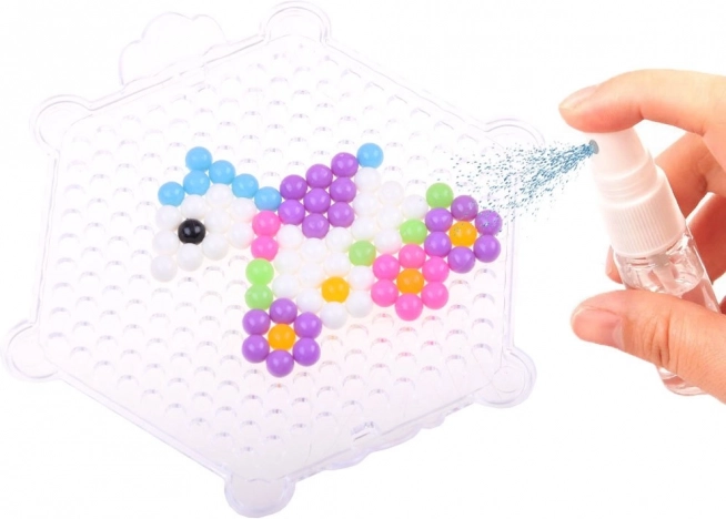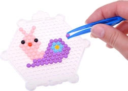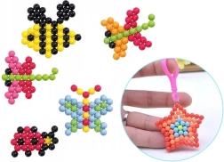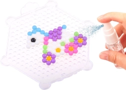 Cu acest set creativ, copiii și adulții pot crea decorațiuni colorate într-un mod simplu și distractiv. Doar alegeți un motiv din cartea adiacentă, puneți mărgelele conform șablonului și stropiți-le cu apă pentru a se lipi.