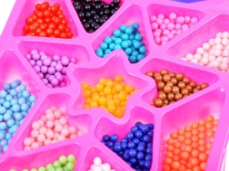 Mărgelele sunt sortate pe culori în compartimente separate, facilitând alegerea și utilizarea lor.