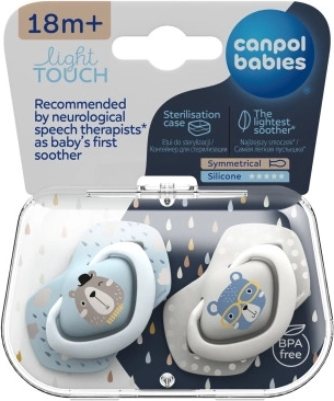 Suzetele au tetină simetrică, realizată din silicon de înaltă calitate – fără miros și fără gust. Light touch – cea mai ușoară suzetă de la Canpol babies, a fost dezvoltată pentru cei mai mici copii și este recomandată de 88% dintre logopezii neurologi! (Pe baza unui studiu într-un grup de 25 de logopezi neurologi, organizat de compania Canpol în 2020).