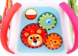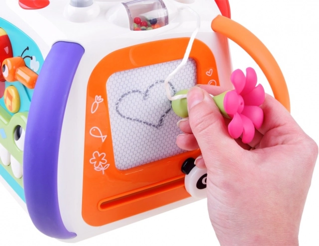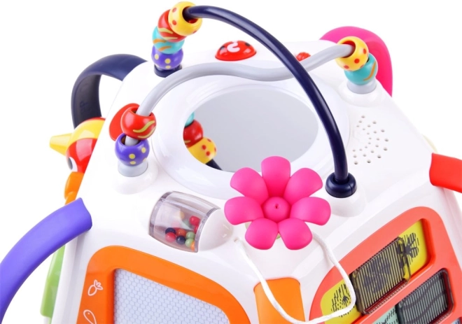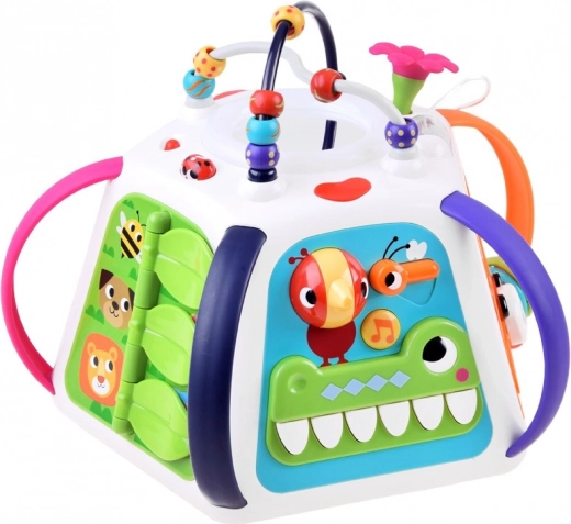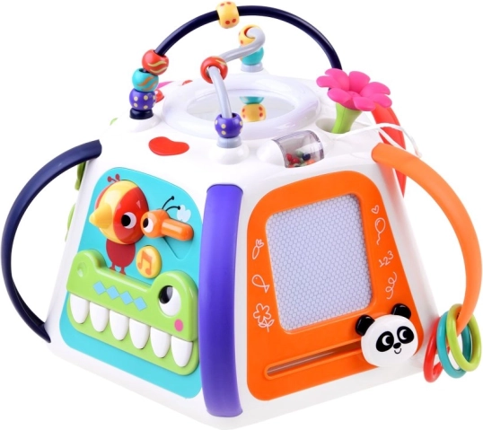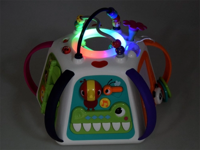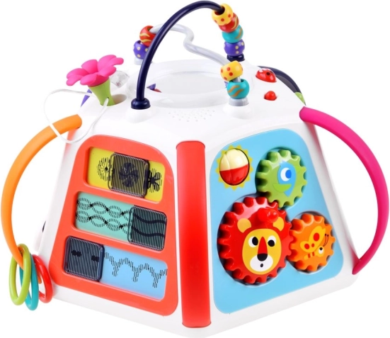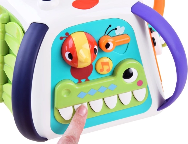 La pornire, cubul redă melodii, efecte sonore și elemente luminoase, care îi motivează pe copii să exploreze în continuare. Nu lipsesc clapele tip crocodil, elemente mobile, panouri glisante cu efect optic de animație „vie” și o oglindă sigură.