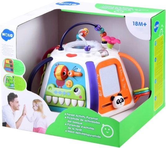 Multicubul educațional HOLA aduce un spectru bogat de activități într-o singură jucărie compactă. Fiecare față oferă o abilitate diferită: de la desen pe magnetoscop, la rotirea roților dințate, până la descoperirea animalelor sub frunze cu feedback sonor. Partea superioară este decorată cu un labirint cu mărgele, care susține coordonarea mână-ochi.