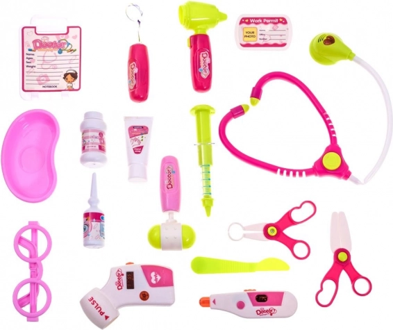 Stetoscop cu inimioară clipitoare, termometru și tensiometru cu valori iluminate, otoscop, seringă, foarfecă, ciocănel și alte accesorii.