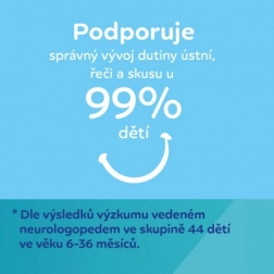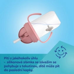 Paiul din silicon se mișcă odată cu lichidul, astfel încât copilul bea confortabil stând în șezut, în cărucior sau la o ușoară înclinare – până la ultima picătură.