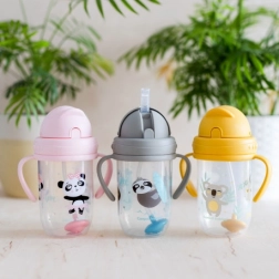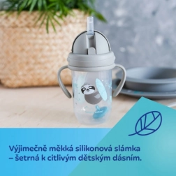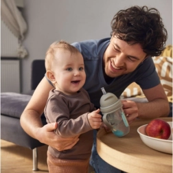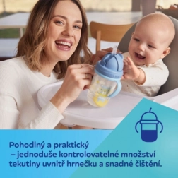 Mânerele late ergonomice facilitează prinderea pentru cei mici. Cana este potrivită de la 6 luni, fabricată din materiale sigure fără BPA și compatibilă cu paie de schimb pentru întreținere ușoară.