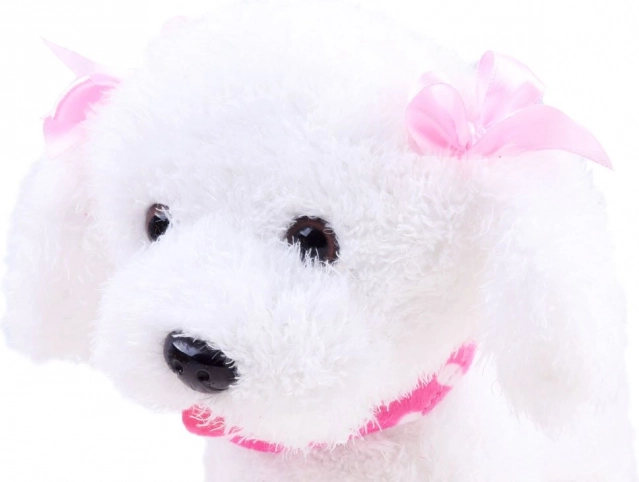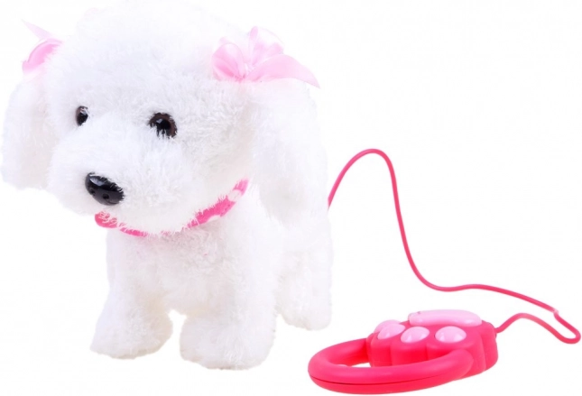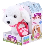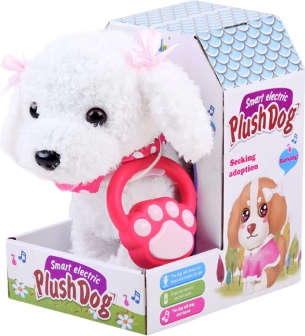 Conectați lesa și, cu ajutorul butonului, activați mersul și lătratul. Copiii pot plimba cățelul pe suprafețe plane, ca pe un animăluț adevărat.