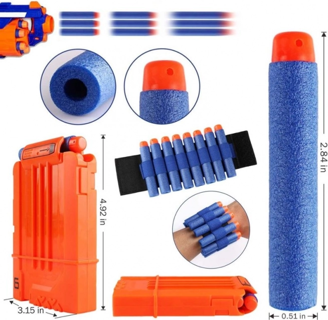 Conținutul setului: Setul include o vestă tactică rezistentă, ochelari de protecție, 30 de săgeți, un bandană/mască imprimată pentru față, o bandă pentru muniție purtată la încheietură și un încărcător suplimentar de muniție.