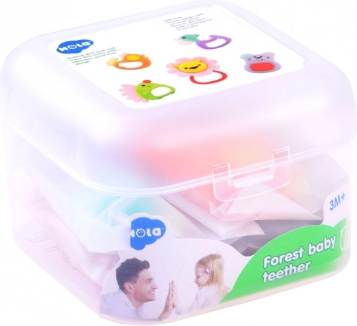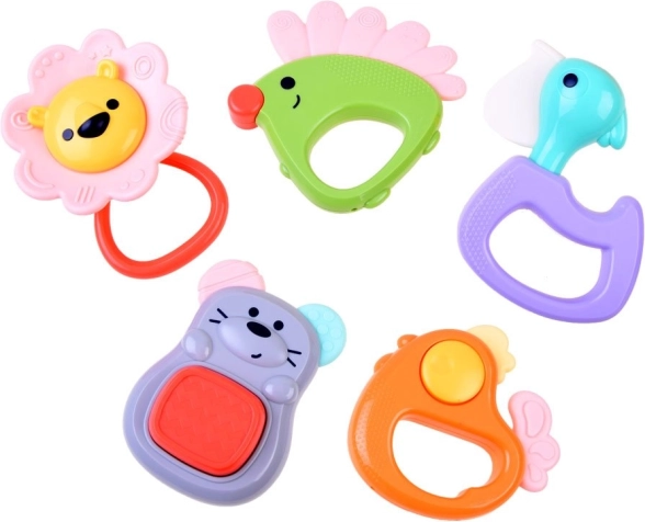 Set colorat de jucării de dentiție în formă de animăluțe, ideal pentru dentiția copiilor mici. Jucăriile de dentiție sunt ușoare, facilitează prinderea și ajută la dezvoltarea abilităților motorii ale copilului.