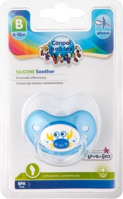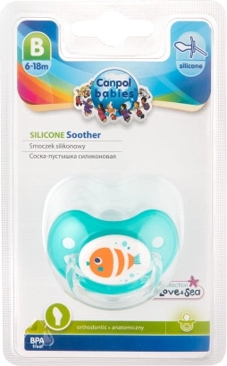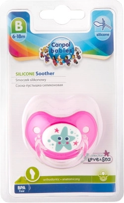 Suzeta LOVE&SEA, realizată din silicon de înaltă calitate, fără gust și miros. Are un scut care luminează. Echipată cu tetină modelată ortodontic. Datorită orificiilor din scut, suzeta nu irită gura sensibilă a copilului. Lumina difuză în discul întunecat facilitează găsirea pe timp de noapte. Fără BPA. Disponibilă în mai multe culori și 3 mărimi: 22/506 0–6 luni, 22/507 6–18 luni, 22/508 de la 18 luni. Scutul special, ventilat, previne iritarea pielii din jurul gurii delicate a copilului. Tetița este realizată din silicon transparent, fără gust și miros. Mâner confortabil – facilitează oferirea suzetei și permite atașarea ușoară la o panglică sau un lanț pentru suzetă. Design colorat și original. Proiectată pentru copii cu vârsta de 6–18 luni. Fabricată din material sigur, fără bisfenol A. Instrucțiuni de utilizare: Înainte de prima utilizare, din motive de igienă, sterilizați suzeta în apă clocotită aproximativ 5 minute. După răcire, stoarceți apa rămasă din suzetă. Înainte de fiecare utilizare, spălați suzeta temeinic în apă caldă. Nu utilizați agenți antibacterieni sau detergenți chimici. Utilizarea excesivă a detergenților poate deteriora piesele din plastic. Nu înmuiați niciodată suzeta în substanțe dulci sau medicamente – expuneți copilul riscului apariției cariilor/defectelor smalțului dentar. Folosiți suzeta maximum 1–2 luni, apoi înlocuiți-o din motive de igienă și siguranță. Dacă suzeta intră în gura copilului, NU VĂ PANICAȚI – suzeta este concepută astfel încât copilul să nu o poată înghiți și o puteți scoate în siguranță din gură. Scoateți suzeta cât mai atent posibil. Păstrați suzeta într-o cutie curată, uscată și închisă. Recomandăm să nu se utilizeze suzete la copiii mai mari de 3 ani. Important! Pentru siguranța și sănătatea copilului dumneavoastră! Înainte de fiecare oferire copilului, verificați starea suzetei. Verificați calitatea tetinei prin întindere atentă în toate direcțiile. La primele semne de deteriorare, aruncați suzeta imediat și nu o mai folosiți. Folosiți doar clame și lanțuri pentru suzetă care corespund standardului EN12586. Nu atașați niciodată suzeta de șnururi, șireturi sau panglici ale hainelor. Copilul se poate sufoca. Nu lăsați suzeta în lumina directă a soarelui, în apropierea unei surse de căldură sau în soluții dezinfectante mai mult decât este recomandat – puteți slăbi tetina suzetei. Țineți capacul scos departe de copil – preveniți riscul de sufocare. Suzeta din silicon respectă cerințele: Directiva Parlamentului European și a Consiliului 2001/95/EC privind siguranța generală a produselor. EN 1400 - 1 Produse pentru îngrijirea copilului - Suzete pentru sugari și copii mici - Partea 1: Cerințe generale de siguranță și informații despre produs. EN 1400 – 2 Produse pentru îngrijirea copilului - Suzete pentru sugari și copii mici - Partea 2: Cerințe mecanice și teste. EN 1400 - 3 Produse pentru îngrijirea copilului - Suzete pentru sugari și copii mici - Partea 3: Cerințe și teste chimice.