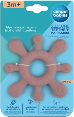 Mușcătorul din silicon Canpol babies cu proeminențe a fost conceput având în vedere confortul și dezvoltarea copilului. Textura variată masează delicat gingiile și atenuează durerea în timpul erupției dentare. Forma mușcătorului este ideală pentru mâinile mici ale copiilor și facilitează prinderea. Mușcătorul este realizat din silicon moale, elastic și sigur, blând cu gingiile sensibile ale bebelușului. Mușcătorul din silicon Canpol babies STEA cu proeminențe nu conține BPA (bisfenol A) dăunător, fiind complet sigur pentru sănătatea copilului. Mușcătorul din silicon Canpol babies, cu diferite texturi pe marginile stelei, susține dezvoltarea motricității copilului.Aduce alinare în timpul erupției dentare!Ușor și practic – ideal pentru mâinile mici ale copiilor.Silicon moale și sigur – blând cu gingiile sensibile ale copilului.Susține dezvoltarea motricității fine și coordonarea mână-ochi.Produsul este destinat copiilor de la 3 luni+.Jucăria este realizată din material sigur, fără bisfenol A.Instrucțiuni de utilizare: Mențineți jucăria curată. Spălați cu o perie moale sub jet de apă, folosind un detergent delicat, clătiți bine.Important! Pentru siguranța și sănătatea copilului dumneavoastră! Înainte de prima utilizare, opăriți cu apă clocotită. Nu fierbeți, nu sterilizați. Nu lăsați mușcătorul în lumina directă a soarelui, ar putea să se decoloreze sau să crape. Verificați cu atenție înainte de fiecare utilizare. Înlocuiți produsul dacă este uzat, deteriorat sau mușcat. Păstrați instrucțiunile pentru utilizări ulterioare! Nu este potrivit pentru spălarea în mașina de spălat vase, fierbere și sterilizare în sterilizator.Mușcătorul elastic corespunde cerințelor: Directiva Parlamentului European și a Consiliului 2009/48/CE privind siguranța jucăriilor, EN 71 - 1 Siguranța jucăriilor - Partea 1: Proprietăți mecanice și fizice, EN 71 - 2 Siguranța jucăriilor - Partea 2: Inflamabilitate, EN 71 - 3 Siguranța jucăriilor - Partea 3: Migrarea anumitor elemente.