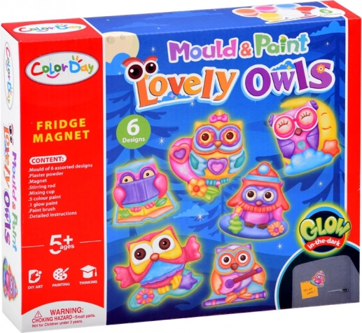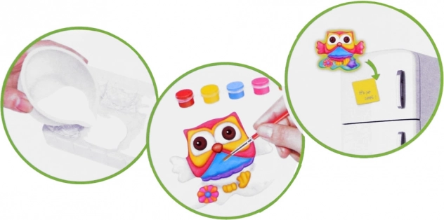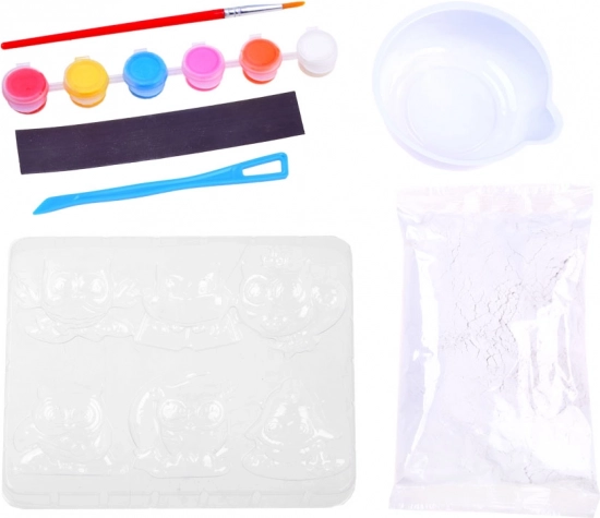 În pachet găsești tot ce ai nevoie: matriță cu motive de bufnițe, pulbere de ghips, pahar pentru amestec, spatulă/cutită de paletă, pensulă, 6 culori și bandă magnetică. Datorită pașilor clari, setul este potrivit și pentru începători și este un cadou excelent.
