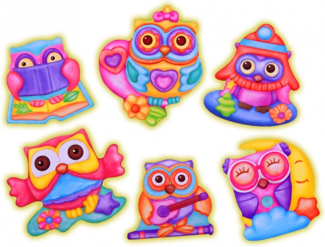 Creează până la 6 magneți diferiți și decorează frigiderul sau colțișorul copiilor cu bufnițe vesele în culori jucăușe.