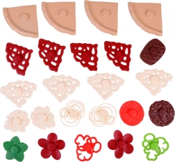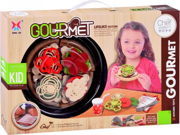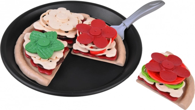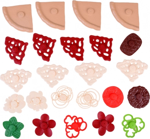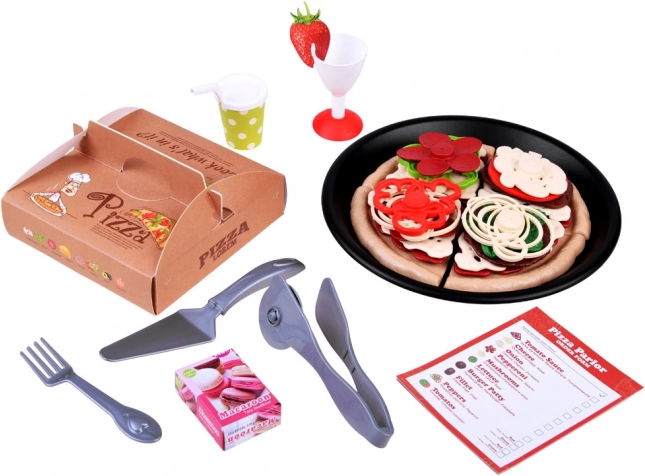 Sunt incluse părți de aluat, sos, felii de brânză și multe toppinguri colorate precum pepperoni, ciuperci, ardei, roșie și salată. Nu lipsesc rotița pentru tăiere, lopățica pentru pizza, tacâmurile, farfuria, paharele pentru băuturi, meniul și cutia pentru pizza.