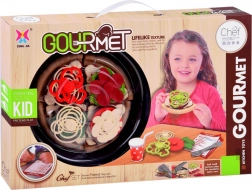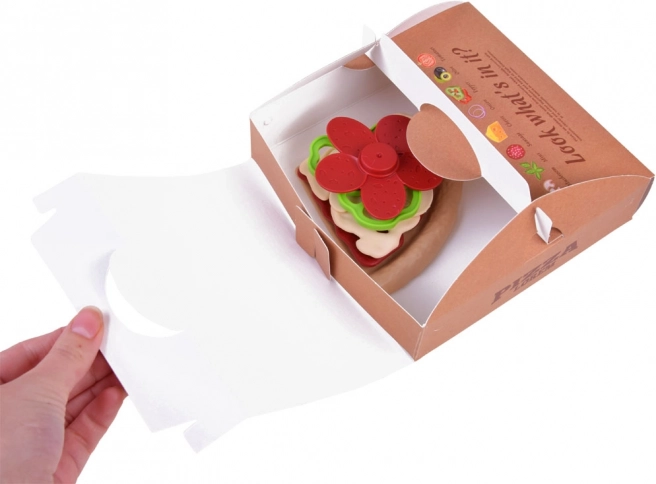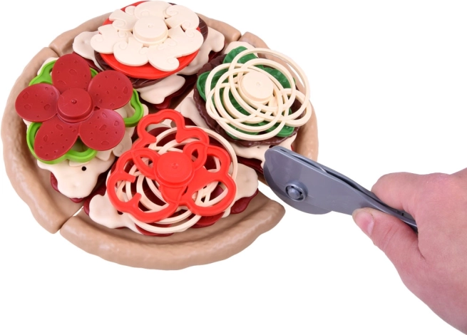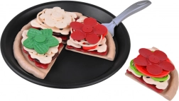 Pizza este împărțită în felii și poate fi ușor „tăiată” cu rotița din plastic. Copiii își exersează motricitatea fină și trăiesc o pregătire realistă a mâncării.