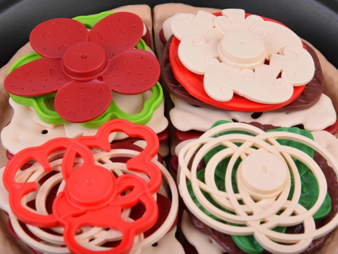Pepperoni, ciuperci, ardei, roșie, salată și alte accesorii permit combinații nesfârșite și susțin jocul creativ de pizzerie.