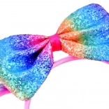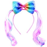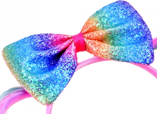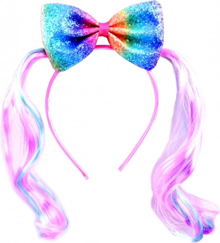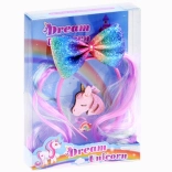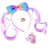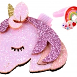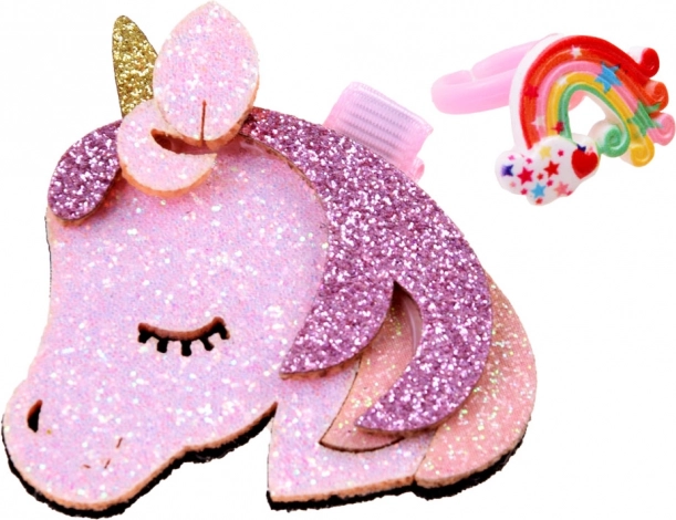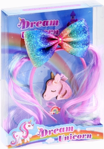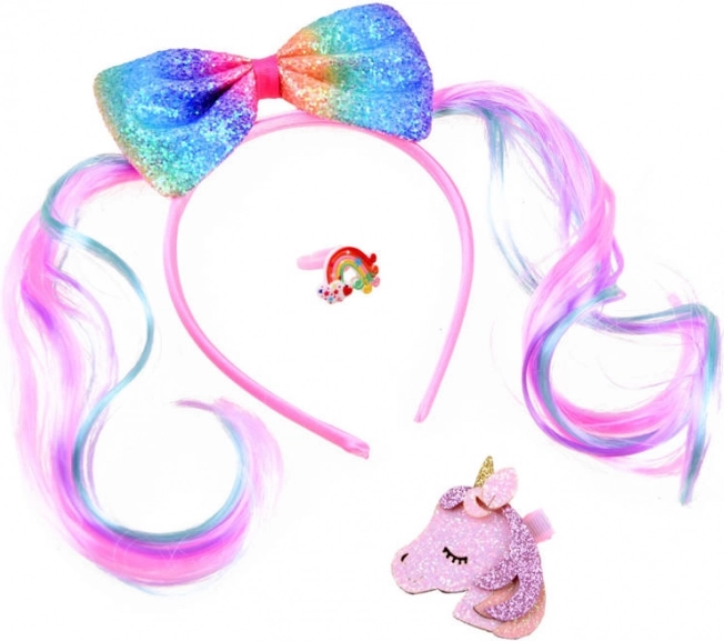Un set stilat și colorat de accesorii de păr creează un look de poveste în câteva clipe. Bentița cu înveliș satinat moale este confortabilă la purtare și este decorată cu o fundă sclipitoare în culorile curcubeului cu motiv de ponei. Setul este completat de o agrafă lucioasă cu unicorn și un inel din plastic cu curcubeu, care adaugă ținutei o notă jucăușă.