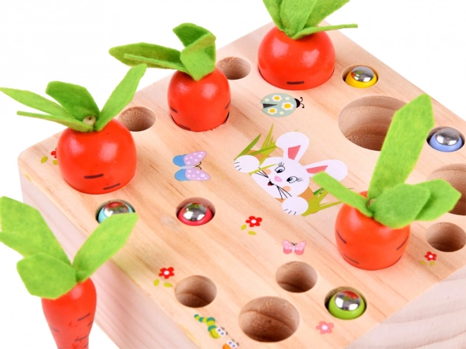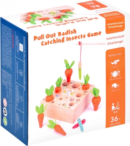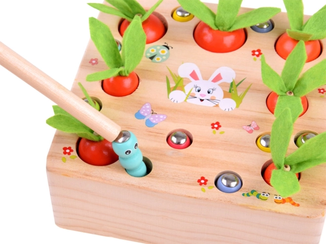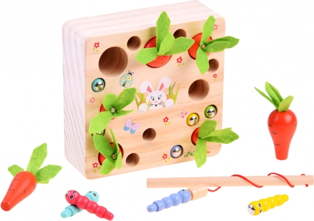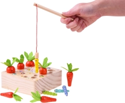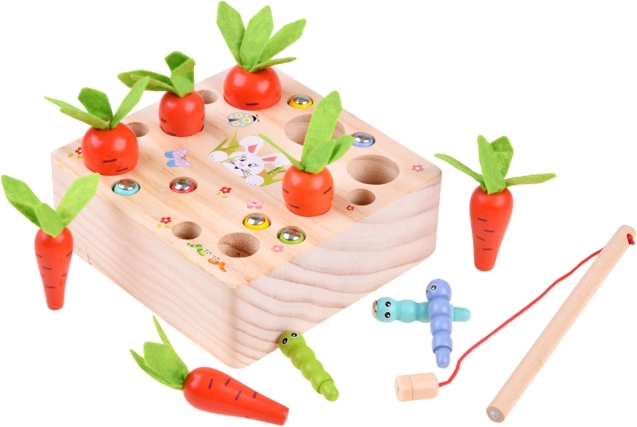 Jocul din lemn cu morcovi și viermișori este conceput pentru cei mai mici, atrăgând prin culorile sale vii și motivele vesele. Copiii pot „culege” jucăuș morcovii și viermișorii cu ajutorul undițelor cu magnet, ceea ce le dezvoltă coordonarea mână-ochi și motricitatea fină.