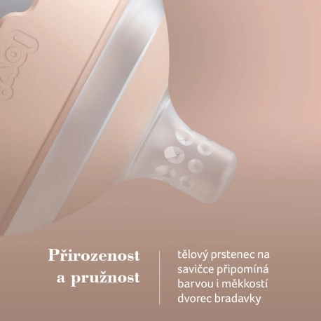 - Naturalete și elasticitate: Inelul delicat al tetinei amintește de culoarea și finețea sânilor mamei.