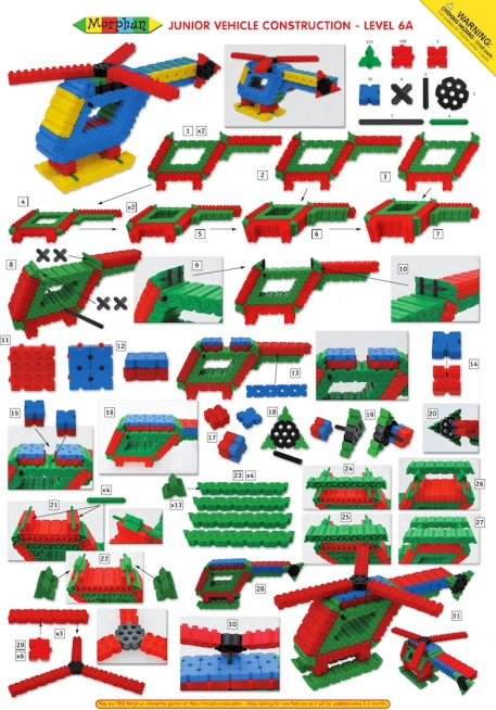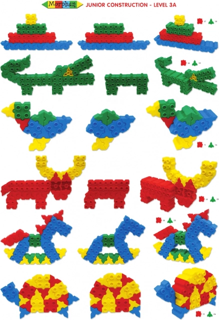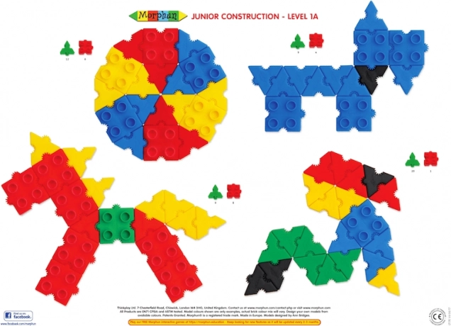 Descoperă setul de construcție Morphun Junior cu 500 de piese colorate, care se conectează de sus, de jos și din lateral pentru a crea modele 3D de vehicule, animale și personaje. Include instrucțiuni A3 de mari dimensiuni și roți pentru construcții mobile. Ambalaj tip cutie cu mâner și închidere de calitate, pentru ordine perfectă. Produs în UE, materiale sigure, certificate CE și EN-71. Excelent pentru dezvoltarea creativității, motricității fine și a imaginației spațiale copiilor.