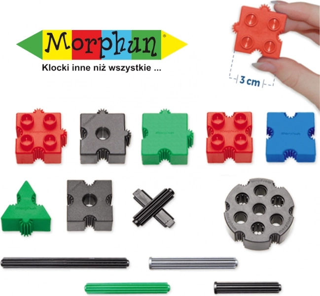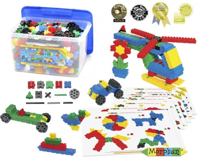 Setul de construcție Morphun Junior oferă copiilor un bogat pachet de 500 de piese rezistente, care, datorită sistemului unic de conectare, permit realizarea unor construcții 3D stabile și ingenioase. Piesele se pot conecta și lateral, astfel încât primele creații pot fi asamblate direct pe instrucțiunile la scară 1:1. În pachet se găsesc și roți pentru a construi mașini, utilaje sau mori de vânt.
