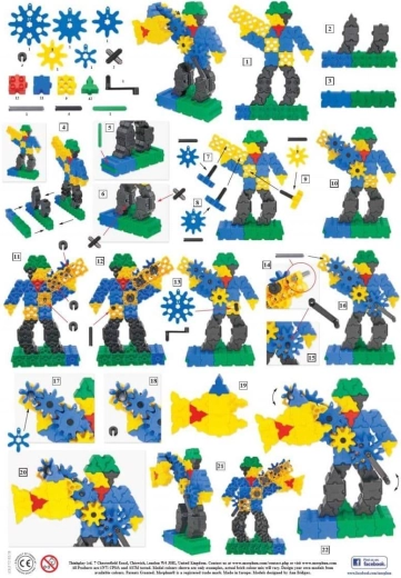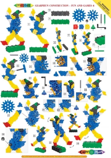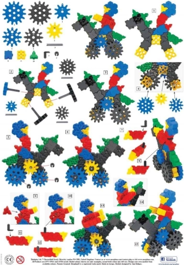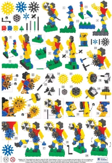 - pătrate, triunghiuri, roți dințate (5 dimensiuni), manivele, cuple; instrucțiuni ilustrate A4 (4 pagini)