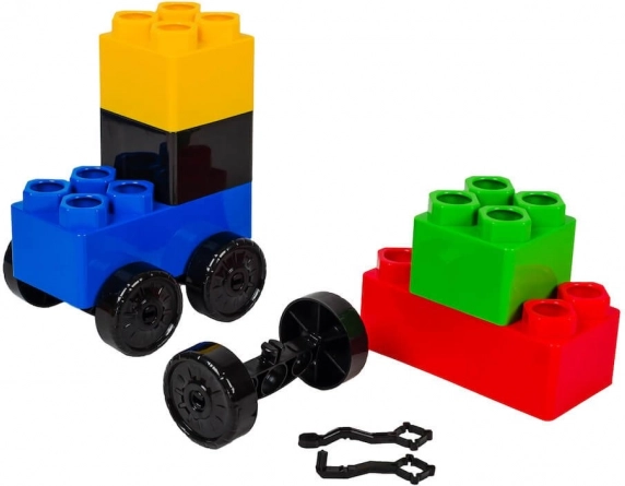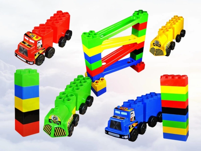 - 103 piese (blocuri mari și mici, cabine, tobogane, axe, roți, încuietori)