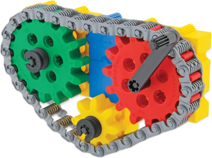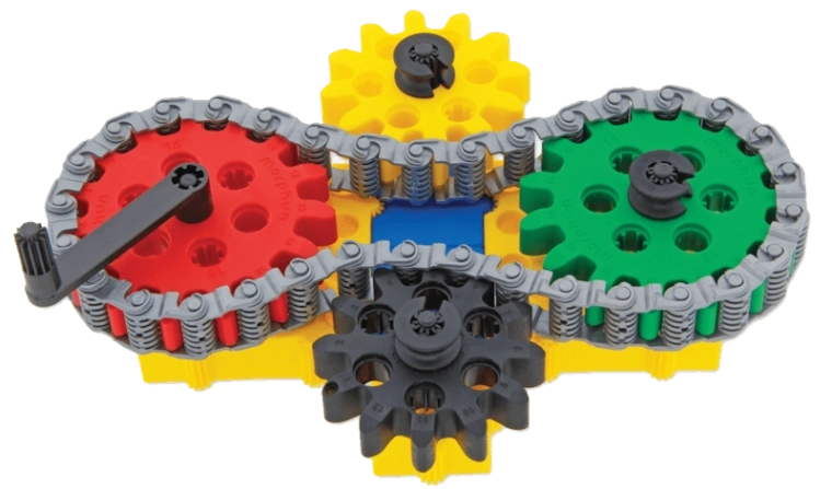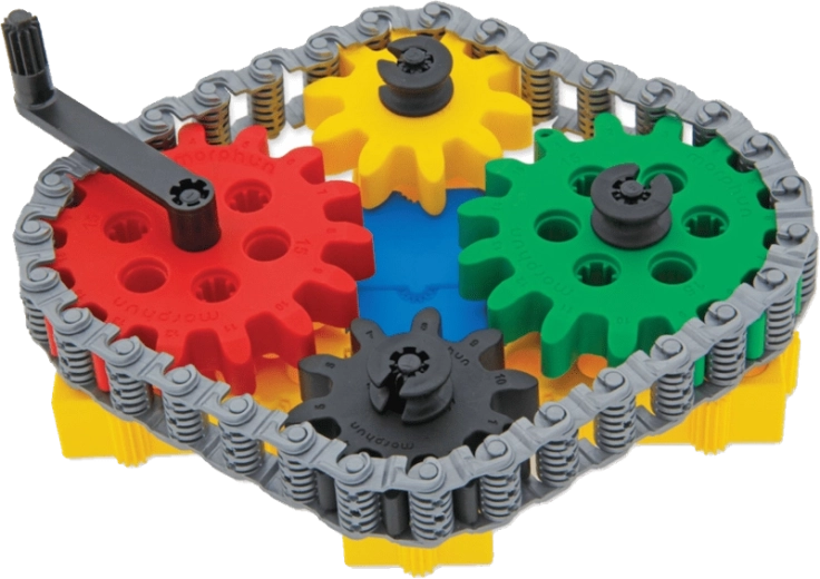 Copiii înțeleg ușor mecanica mișcării – conectează roți dințate, lanțul și manivela și văd cum întregul mecanism prinde viață.