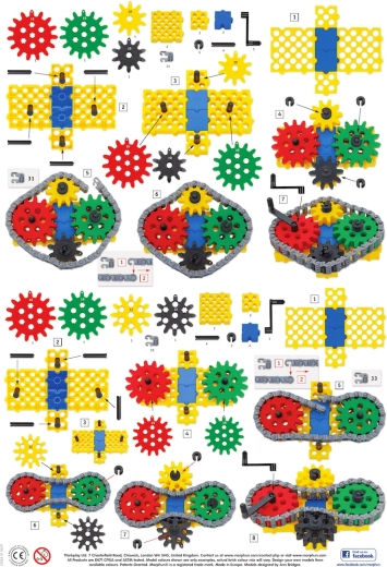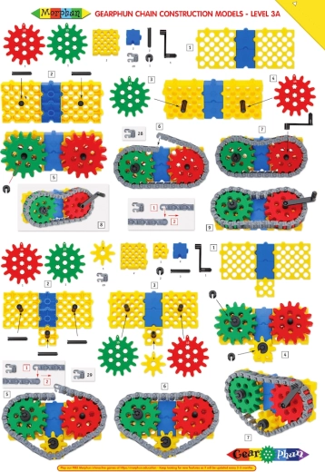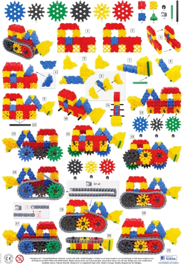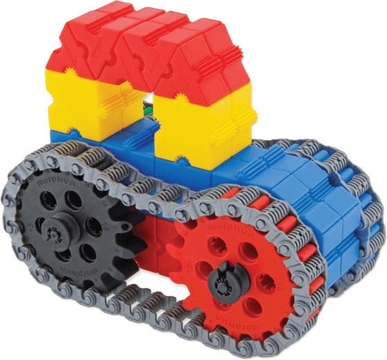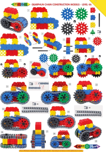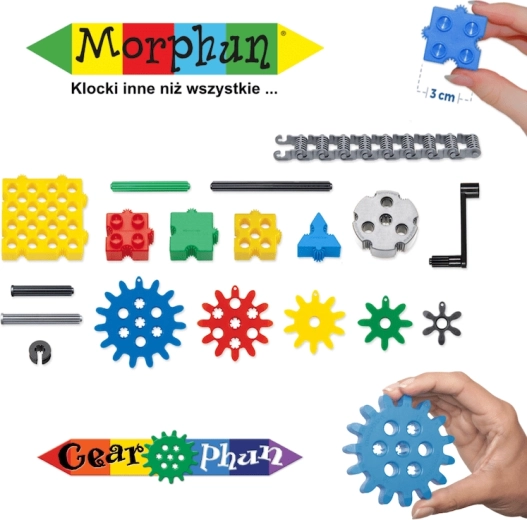 Setul MORPHUN GearPhun aduce blocuri colorate, roți dințate în 5 dimensiuni, lanțuri, conectori și alte elemente pentru construirea mecanismelor funcționale. Pachetul include 4 planșe cu instrucțiuni, datorită cărora copiii construiesc pas cu pas mașinării, vehicule și alte construcții mobile – de la excavator pe șenile la cilindru compactor.