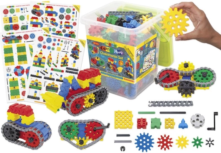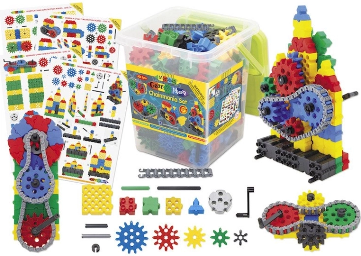 Cinci dimensiuni de roți dințate și un lanț funcțional permit construirea de modele cu transmitere lină a mișcării. Copiii înțeleg intuitiv cum colaborează componentele.