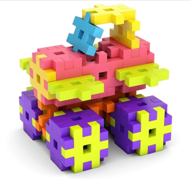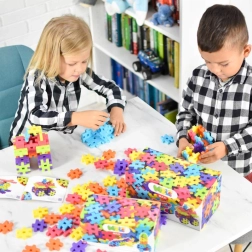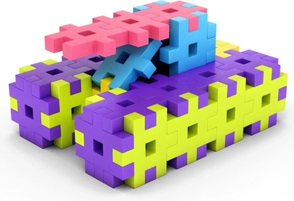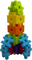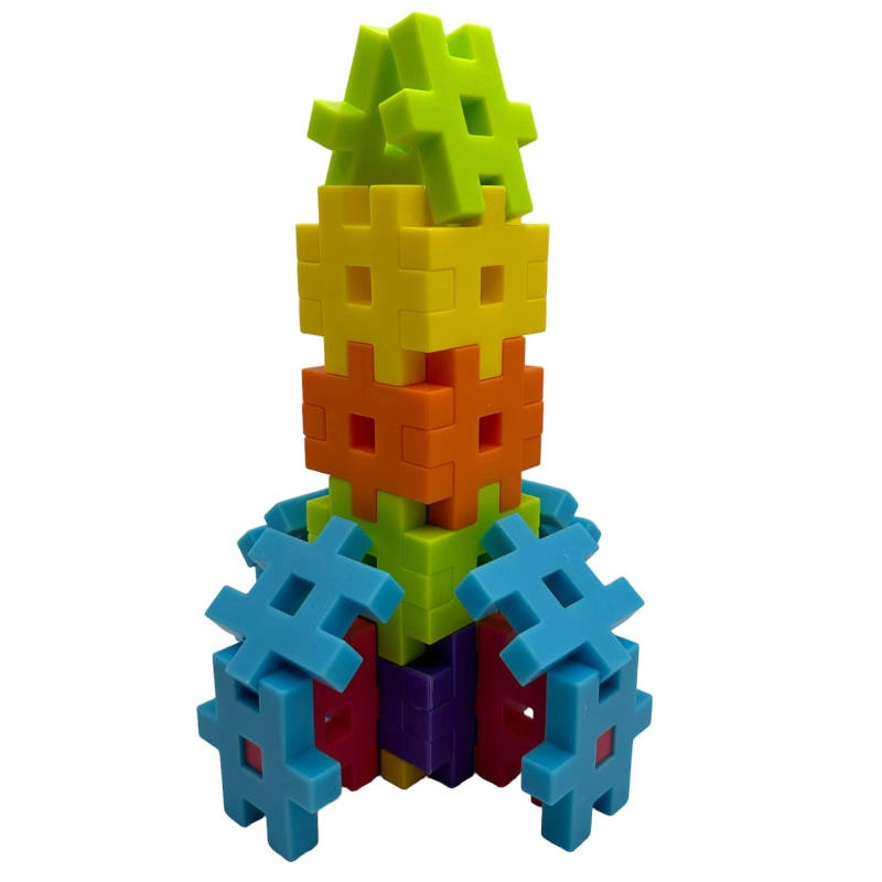 Piesele de dimensiuni mari, colorate, se țin comod în mână, se îmbină bine între ele și invită la crearea unor modele simple sau ingenioase – de la turnuri la vehicule.