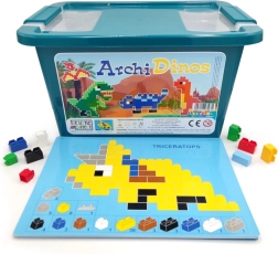 Setul de construcție Little Architect ArchiDinos îmbină distracția cu învățarea. Copiii, urmând 9 carduri cu instrucțiuni față-verso la scară 1:1, construiesc dinozauri iconici precum T‑rex, Triceratops sau Stegosaurus și, în același timp, învață să planifice, să urmeze pașii unul câte unul și să-și dezvolte imaginația spațială.