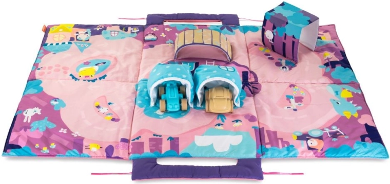 Împreună cu acest covoraș moale, copilul poate petrece ore întregi pline de aventuri minunate. Covorașul ajută la dezvoltarea simțurilor și a imaginației copilului oferind numeroase elemente senzoriale, precum elemente foșnitoare, un pod, un tunel, trasee și buzunare pentru mașinuțe.