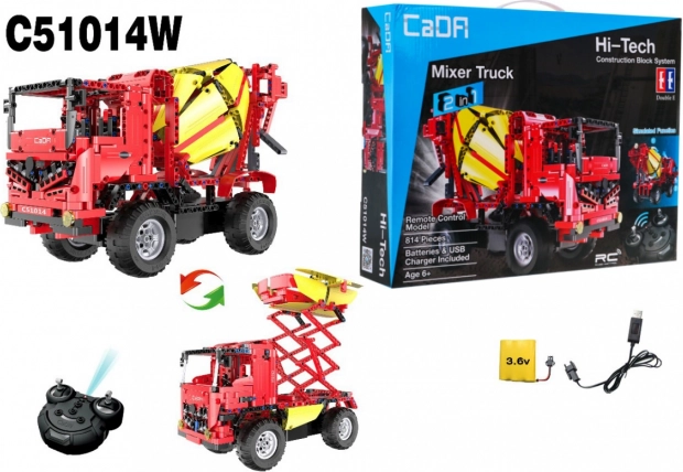 Acest set tehnic CaDA îi va încânta pe micii și marii constructori. Datorită construcției robuste, elementelor funcționale și telecomenzii RC fiabile, copiii se vor bucura de ore întregi de distracție dinamică, dezvoltând totodată motricitatea fină și imaginația. Setul oferă 2 modele într‑un singur pachet: un malaxor de beton detaliat și, alternativ, un camion cu elevator tip foarfecă funcțional.