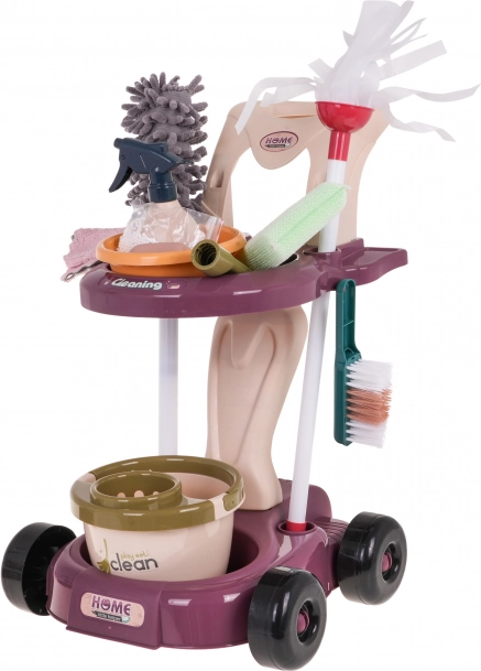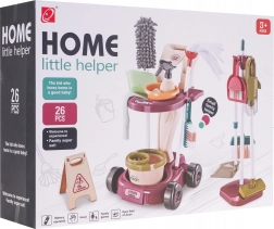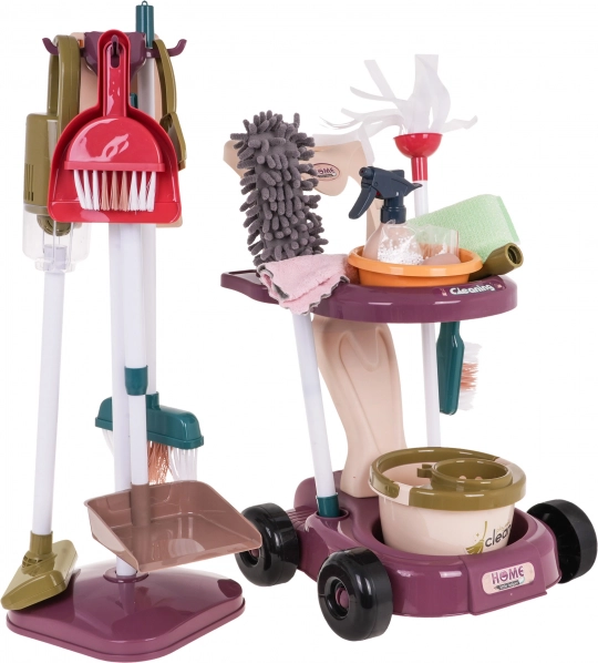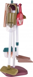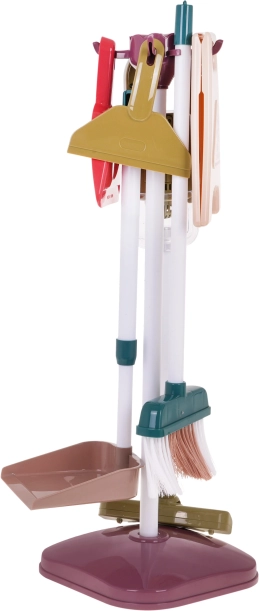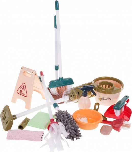 Setul de curățenie pentru copii include instrumente precum mop, perie, mături și un mic aspirator, care imită uneltele reale și aduc realism jocului.