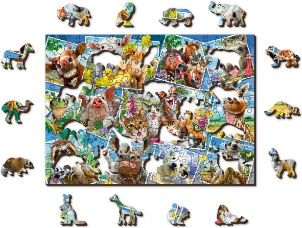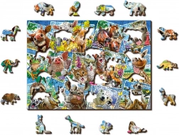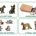 Puzzle-ul din lemn WOODEN CITY cu motivul „Cărți poștale cu animale” oferă o experiență unică de asamblare. Datorită execuției pe ambele fețe, poți alege între asamblarea după imaginea de pe față sau după formele de pe verso, cu un model repetitiv. Detaliile evidențiate cu laser conferă pieselor un aspect impresionant, iar unele dintre ele – în formă de animale, clădiri sau obiecte – pot sta singure ca mici figurine.